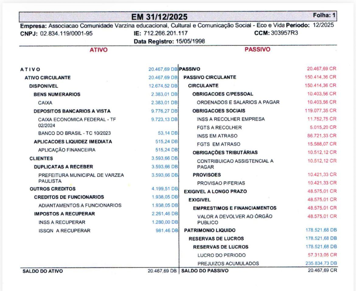 BALAÇO PATRIMONIAL ASSOCIAÇÃO COMUNIDADE VARZINA EDUCACIONAL, CULTURAL E COMUNICAÇÃO SOCIAL - ECO E VIDA - 2023/2024